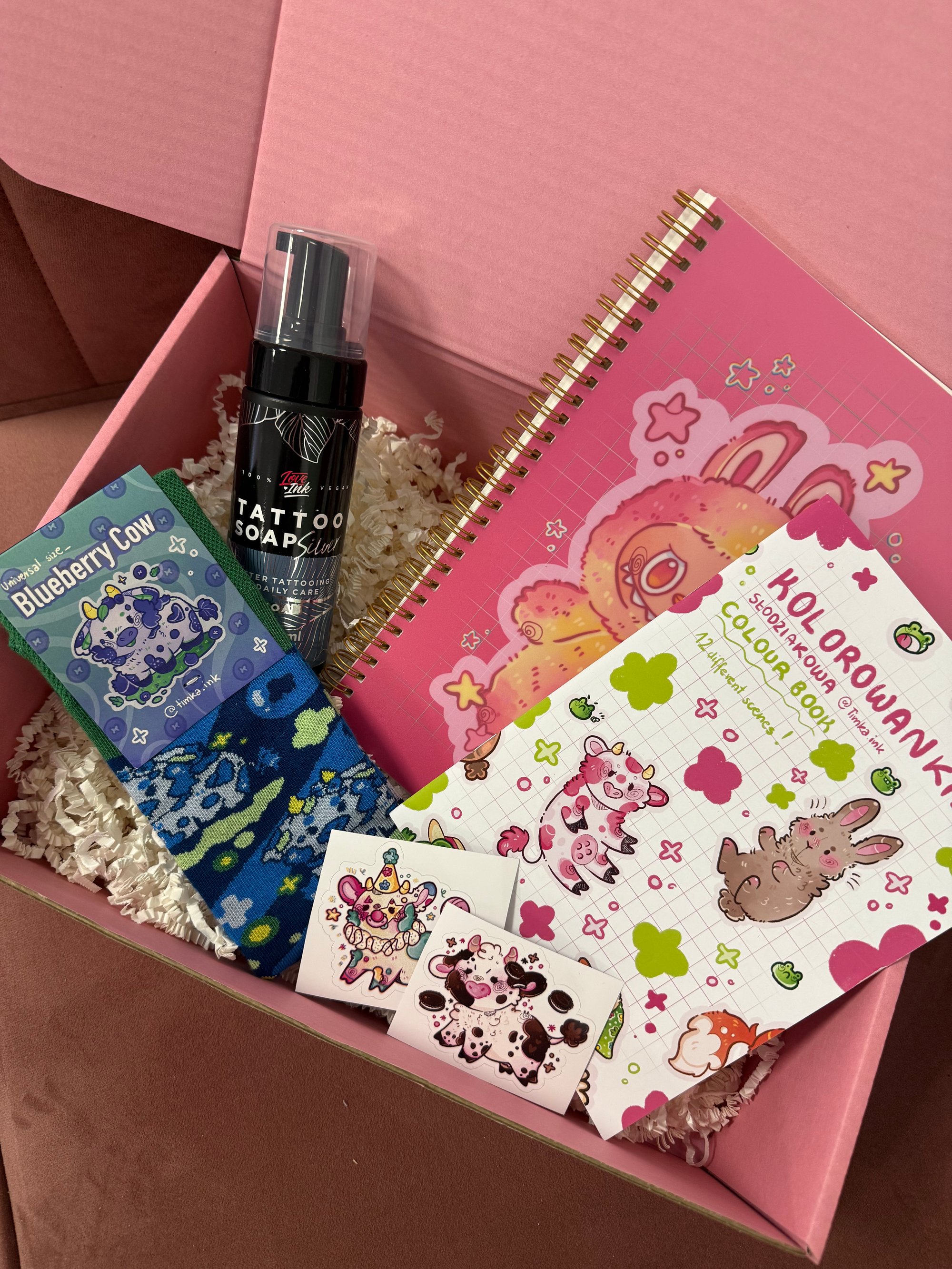 Zestaw prezentowy o wartości 173zł Sticker book 75zl Mydełko LOVE INK do tatuaży 30zł Skarpetki krówki 35zł Kolorowanka z Króliczkami 25zł Naklejki 8zł