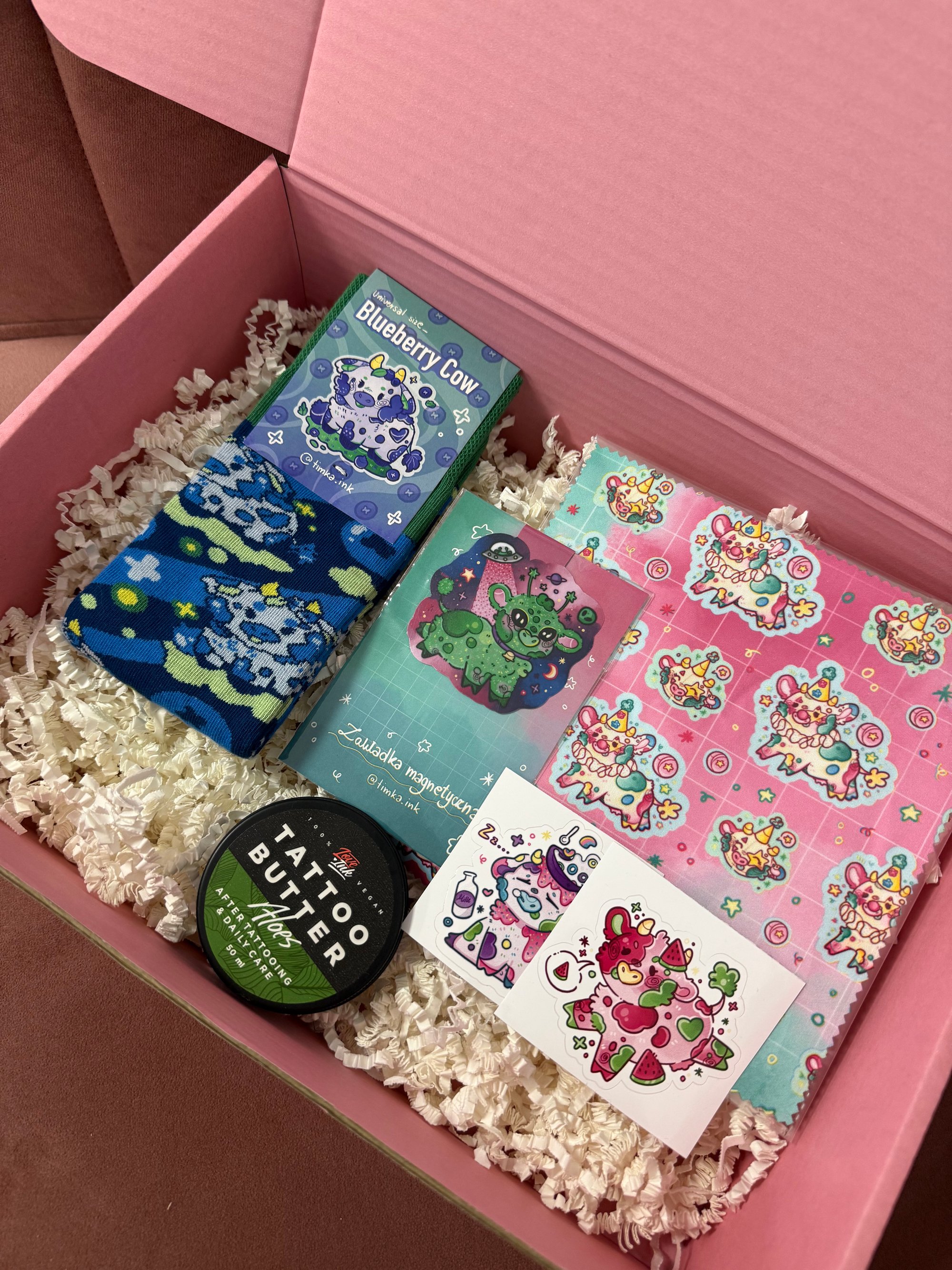 Zestaw prezentowy o wartości 110zł Tattoo butter LOVE INK do tatuaży ALOES 30zł Skarpetki krówki 35zł Zakładka do książek 12zł Chustka do okularów 20zł Naklejki 8zł